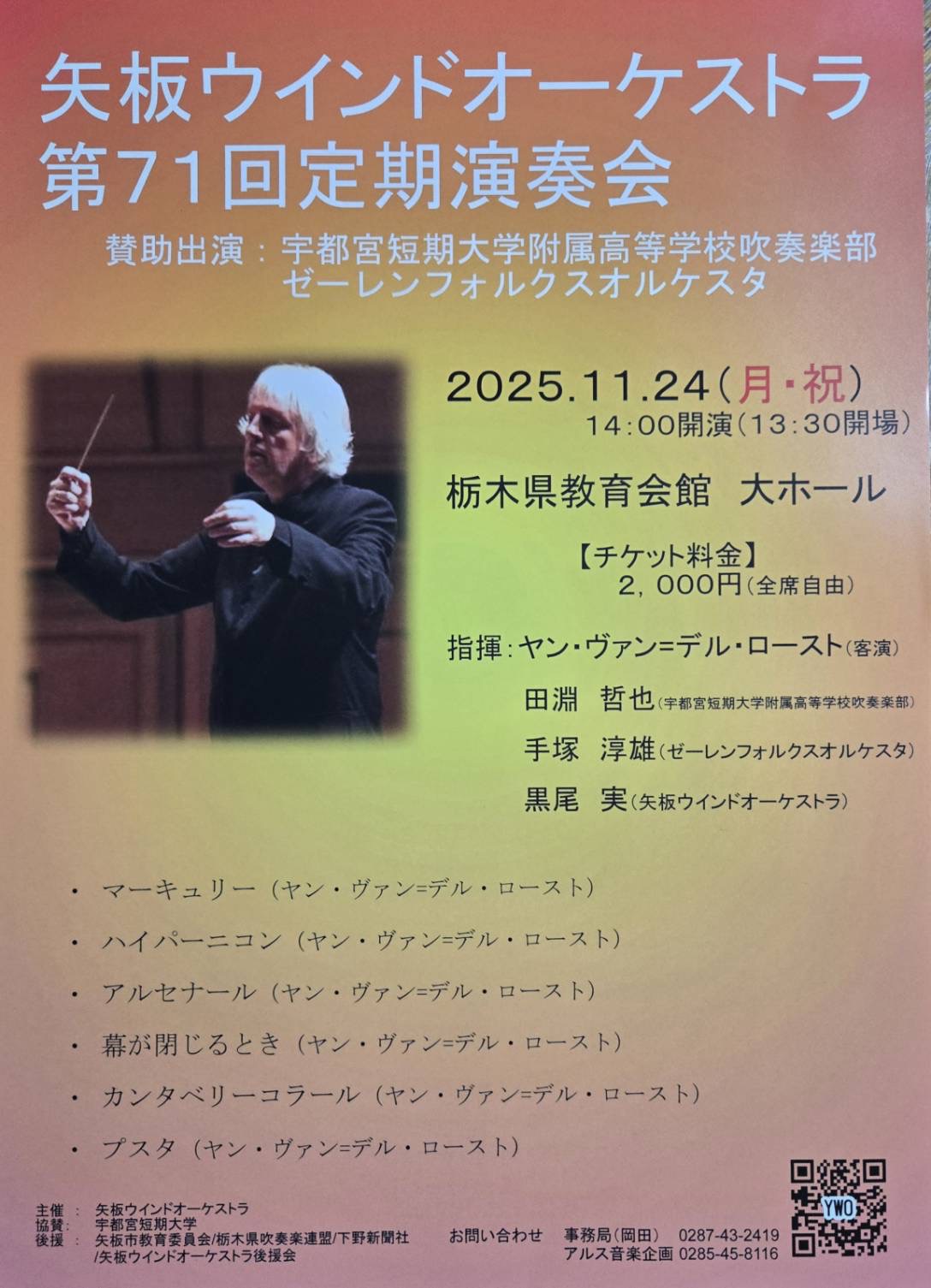 ヤン・バン・デル=ロースト氏をお迎えし、栃木県教育会館にてローストステージを開催致します。また、賛助出演として、ゼーレンフォルクスオルケスタ、宇都宮短期大学附属高等学校吹奏楽部の演奏もあります。